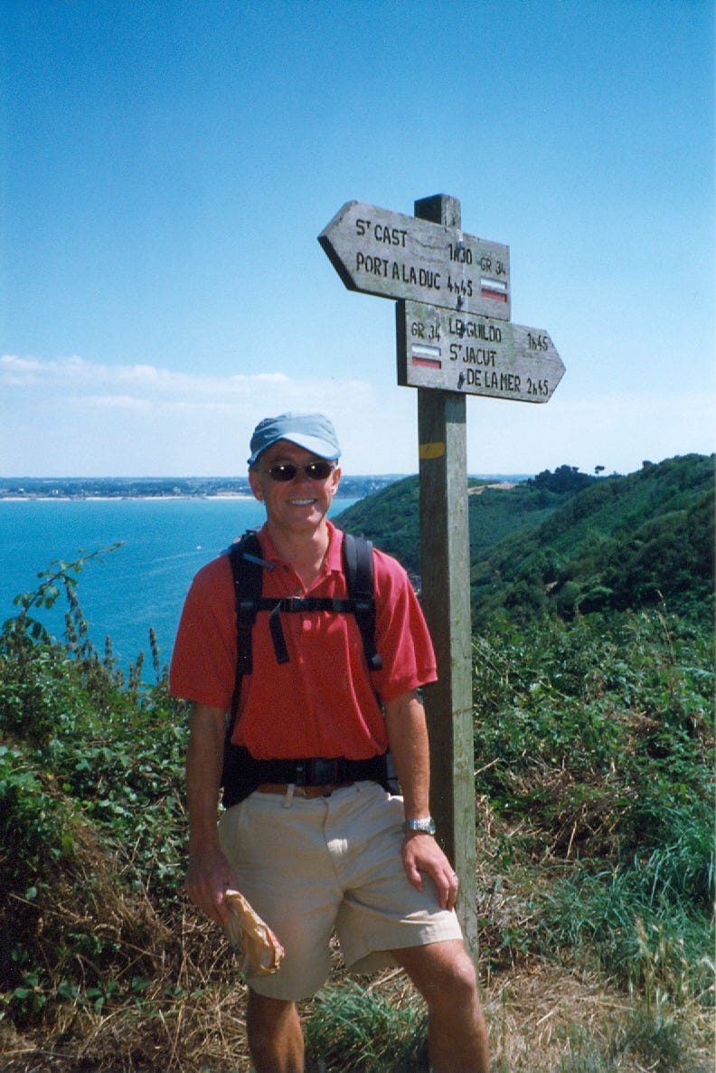 We usually booked the following night’s accommodation each afternoon, but that is as far as we planned ahead, a degree of freedom I’m not sure that would work today. We were hiking the GR34, Sentier des Douaniers, Customs Officers’ Path, one of many Grande Randonnées, the long-distance footpaths in France. No Google maps, no GPS, just a Michelin map, a guidebook, and the signposts like the one above.